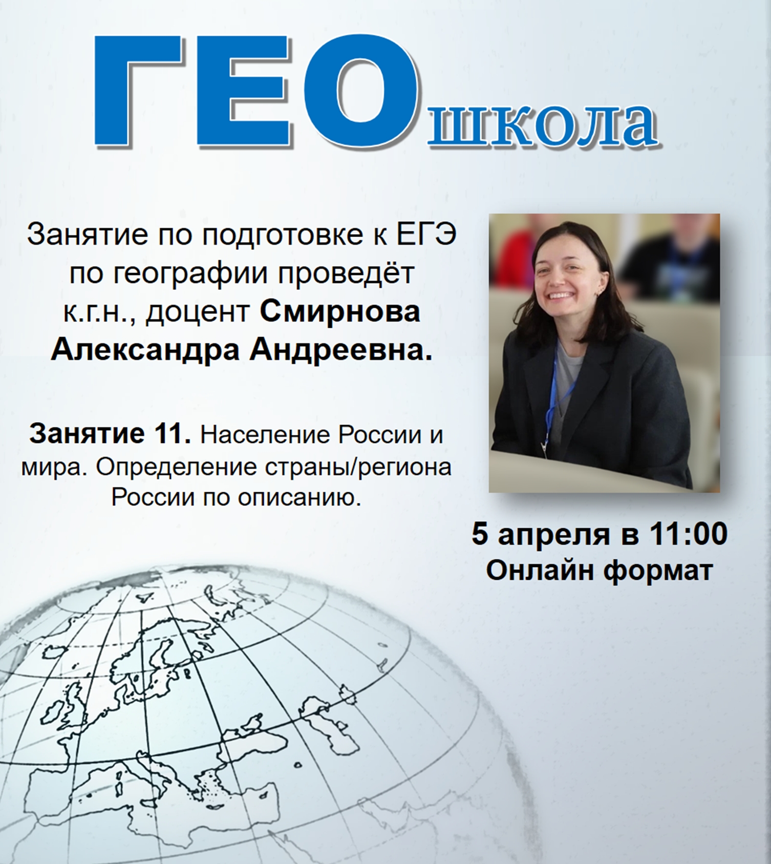 Кандидат географических наук, доцент кафедры социально-экономической географии и территориального планирования Александра Андреевна Смирнова рассмотрит с обучающимися вопросы географии населения на ЕГЭ. Преподаватель вместе с абитуриентами решит ряд заданий на определение страны/региона России по описанию. Будут разобраны варианты заданий 6, 8, 12 и 17.